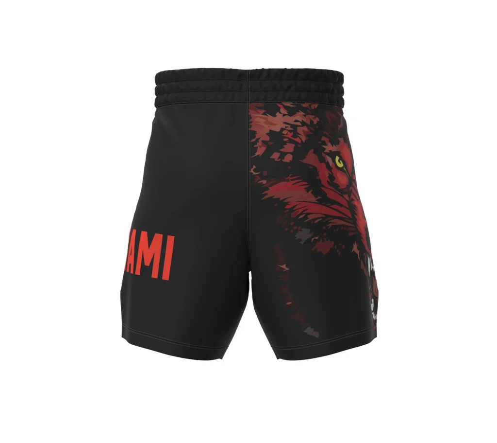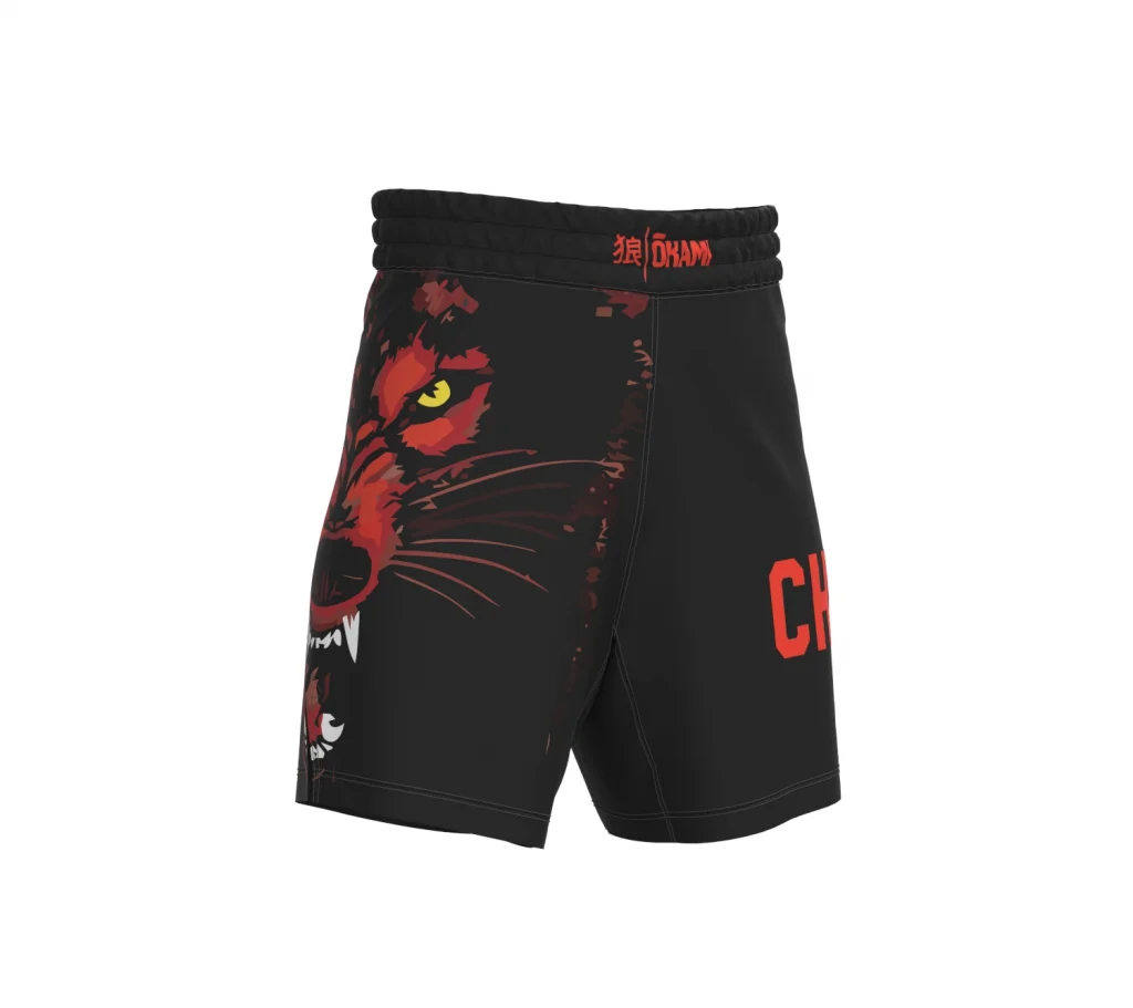 Der Schnitt der Shorts ist auf Bewegungsfreiheit ausgelegt: Seitliche Beinschlitze ermöglichen dynamische Kicks und Takedowns, während ein elastischer Einsatz im Schrittbereich die Beweglichkeit zusätzlich unterstützt.