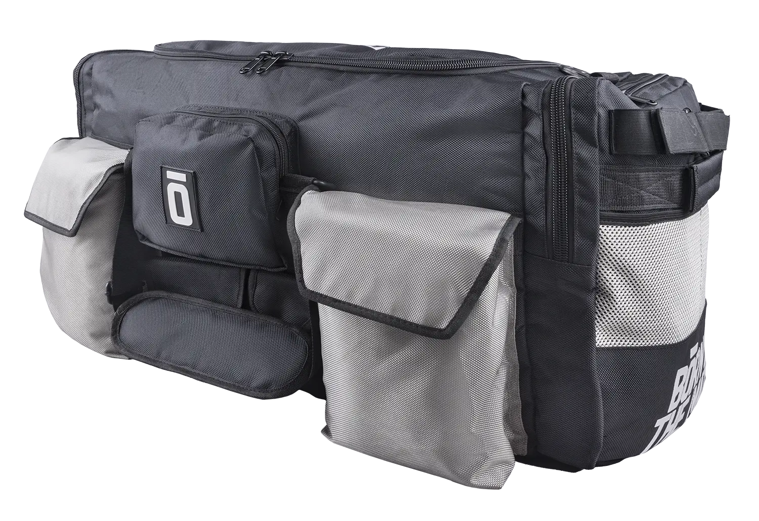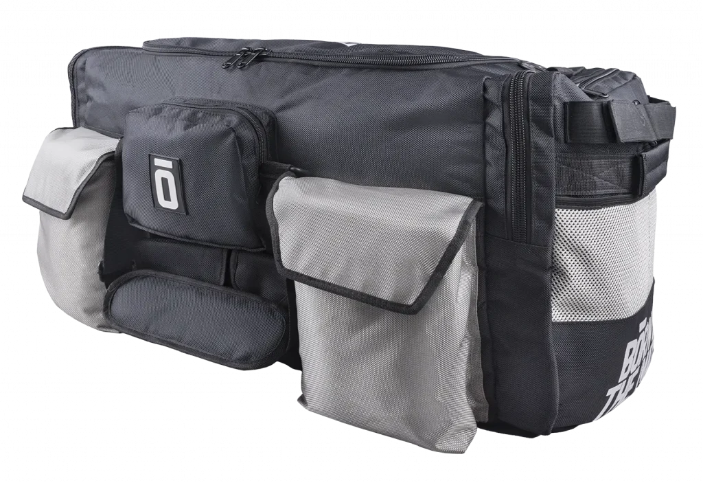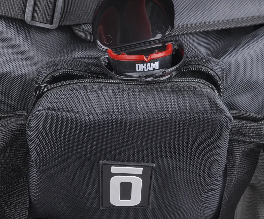 Besonders durchdacht ist die Organisation auf der langen Vorderseite der Tasche. Hier befinden sich zwei große Fächer, die flexibel genutzt werden können – etwa zur getrennten Aufbewahrung von MMA-Handschuhen, Handbandagen, Ankle Guards, einem BJJ-Gürtel oder auch Duschutensilien wie Duschgel oder Shampoo. Dazwischen liegen mehrere kleinere Organisationsfächer, die gezielt für häufig genutzte Kleinteile ausgelegt sind: ein Fach für Smartphone oder Handy, ein separates Fach für den Mundschutz inklusive Case sowie ein weiteres Fach für Fingertape oder Nagelklipser.