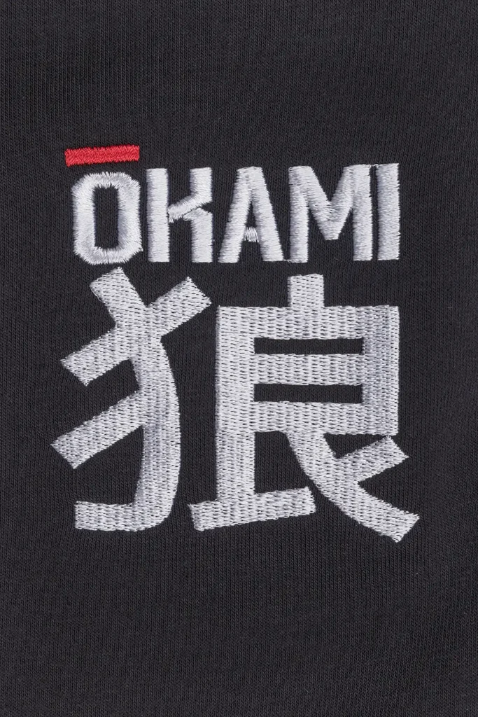 • Gesticktes OKAMI-Logo auf der linken Seite