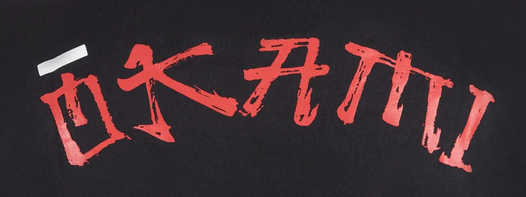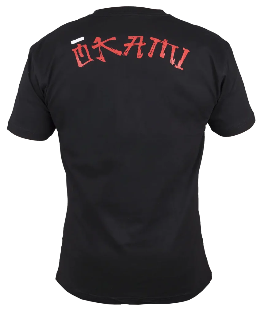 • Kalligrafie-Style OKAMI-Logo auf der Rückseite im Schulterbereich.