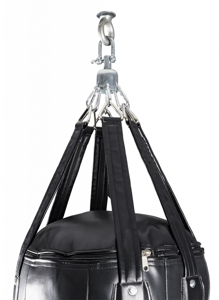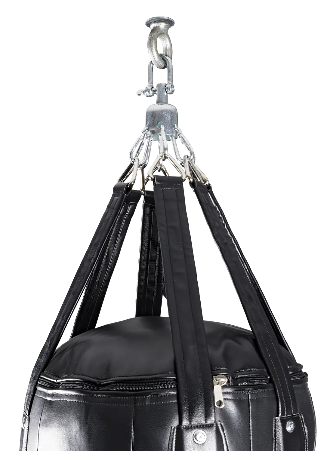 Der Boxsack ist mit geschreddertem Textil gefüllt und bringt ca. 52 kg auf die Waage – optimal für realistisches Schlagfeedback. Die sechs stabilen Aufhängepunkte mit Metallschrauben und der mitgelieferte Drehwirbel sorgen für sichere Befestigung und hohe Beweglichkeit im Training. Die Länge beträgt 1,80 m (mit Aufhängung ca. 2,20 m).